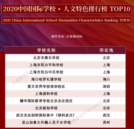 根据2021年京领(中国国际学校人文特色排行榜)中显示,北京致知学校该领域在全国排名排名第七、北京排名第二